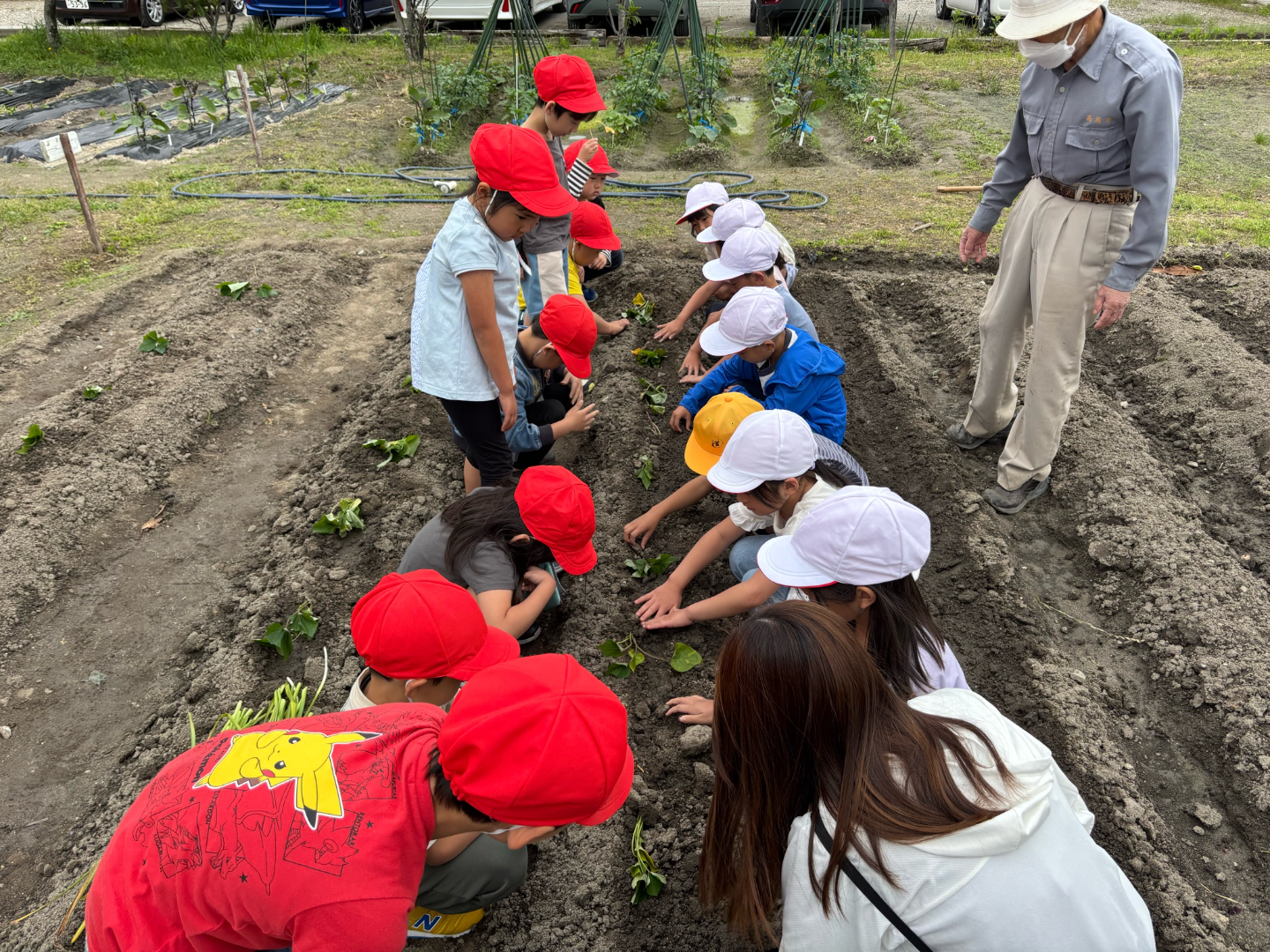 今日は、1年生のみんなでさつまいもの苗植えを行いました。野菜作りの先生のお話を聞きながら上手に植えることができました。10月が楽しみです!!